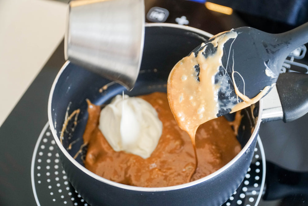 Add water to reduce thickness and stir until combined. Add in the cream, mix well and set aside.