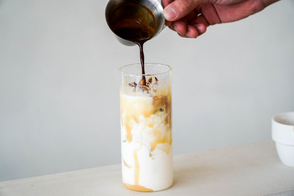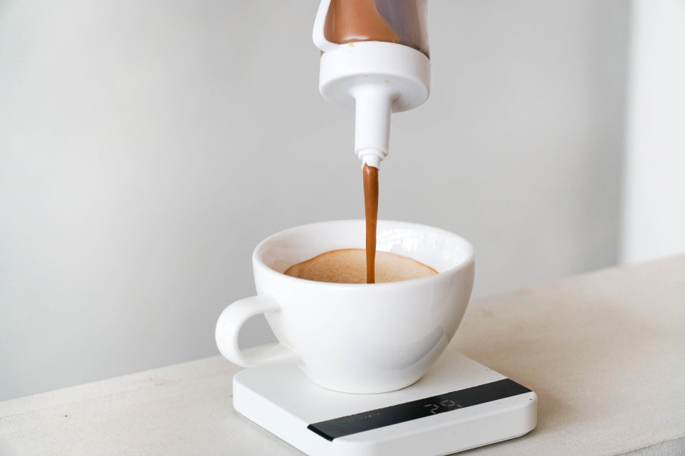 In a mug, add a shot of espresso and 30g of tres leches sauce. Mix well.