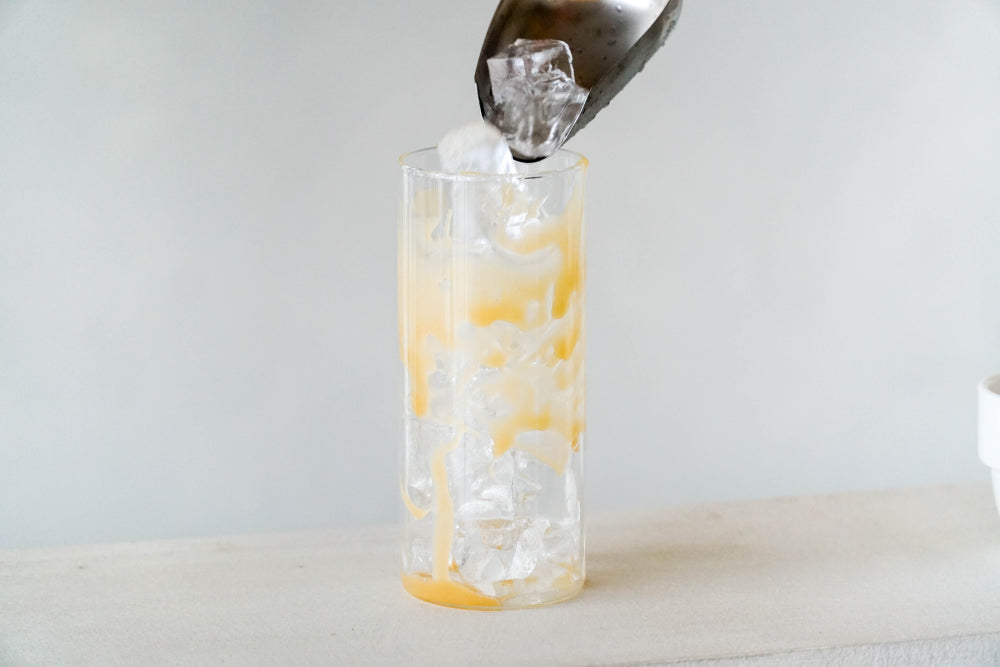 Spread tres leches sauce around the sides of a glass. Add ice.