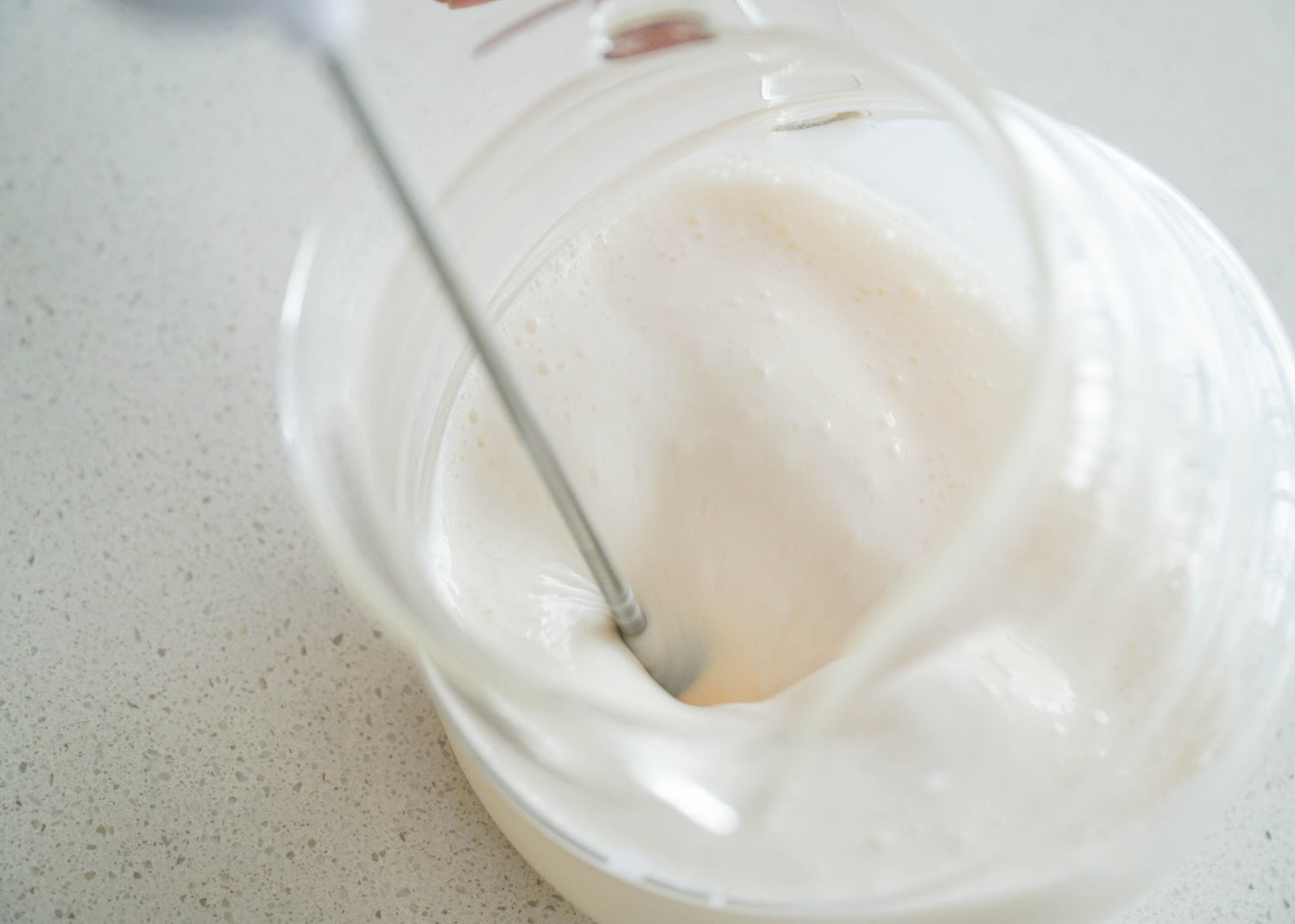 To make the white chocolate coconut cold foam: froth the 20 mL coconut syrup, 20 mL white chocolate sauce, 15 mL whole milk, and 15 mL whipping cream all together. Set aside for later.