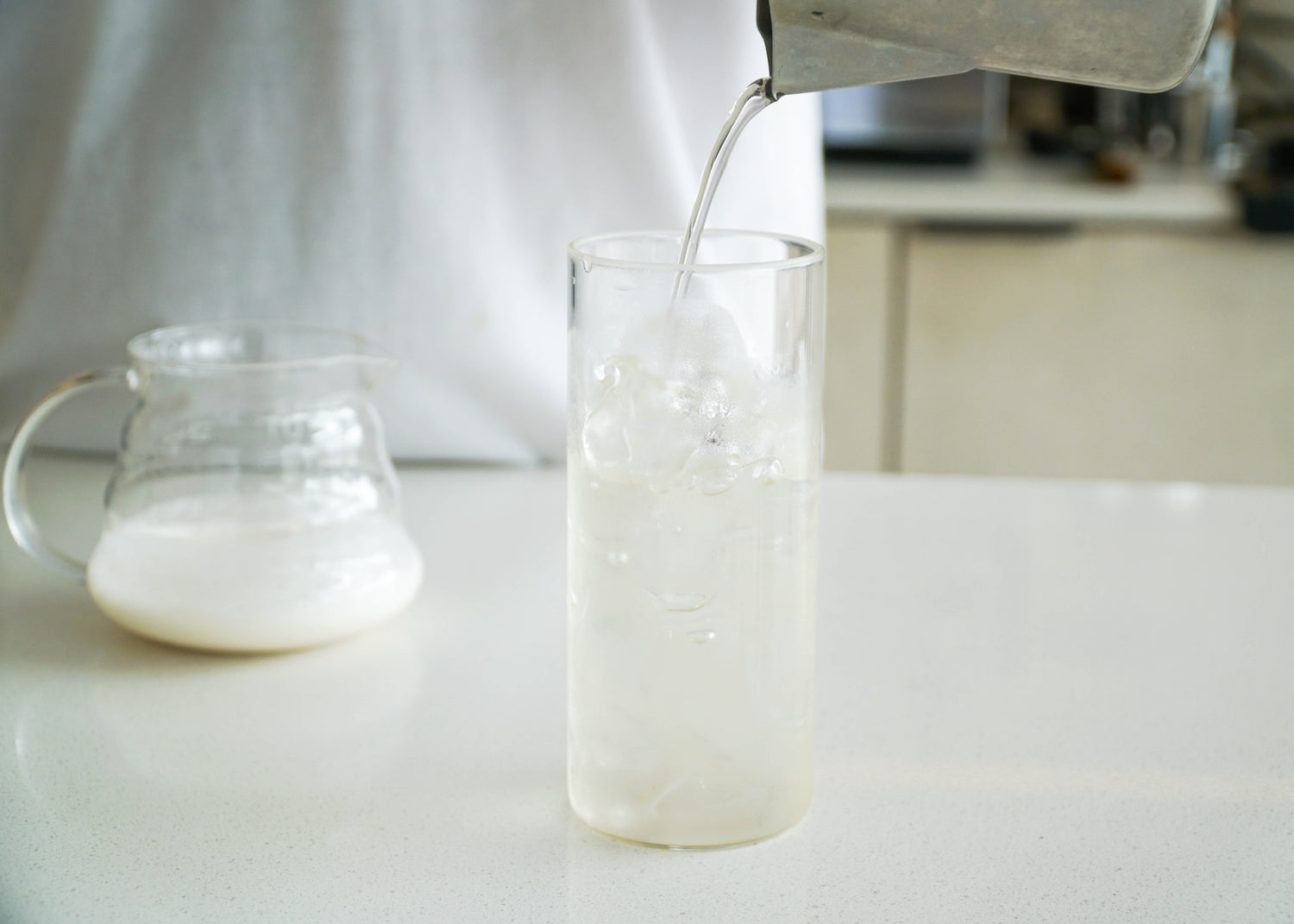 Fill your choice of cup with ice and pour in 140 mL of coconut water.